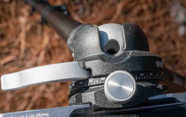 If you choose to lock it into the vertical position, you can then use the 360-degree panorama dial to adjust your camera to any desired angle for the shot you’re after. The panorama dial can then be locked off by using the small tightening lever on the side. This small lever can also be adjusted so as not to inhibit the movement of other functions, by being pulled out, turned, and then released. To help with your adjustments there is a 360-degree indicator ring around the panorama dial.