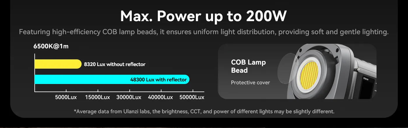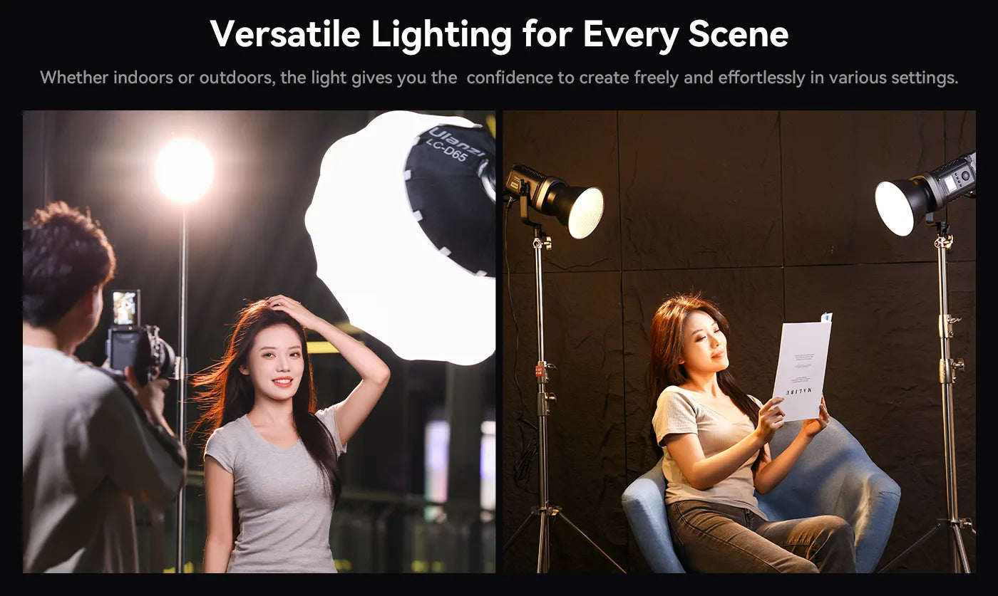 The Ulanzi VL-200Bi 200W V-Mount Video Light offers versatile lighting for every scene, perfect for wedding videography, skit videos, e-commerce livestreaming, and product photography. Featuring high-efficiency COB lamp beads, it provides uniform, soft lighting with a powerful output of 48300 Lux at 6500K@1m with a reflector.
