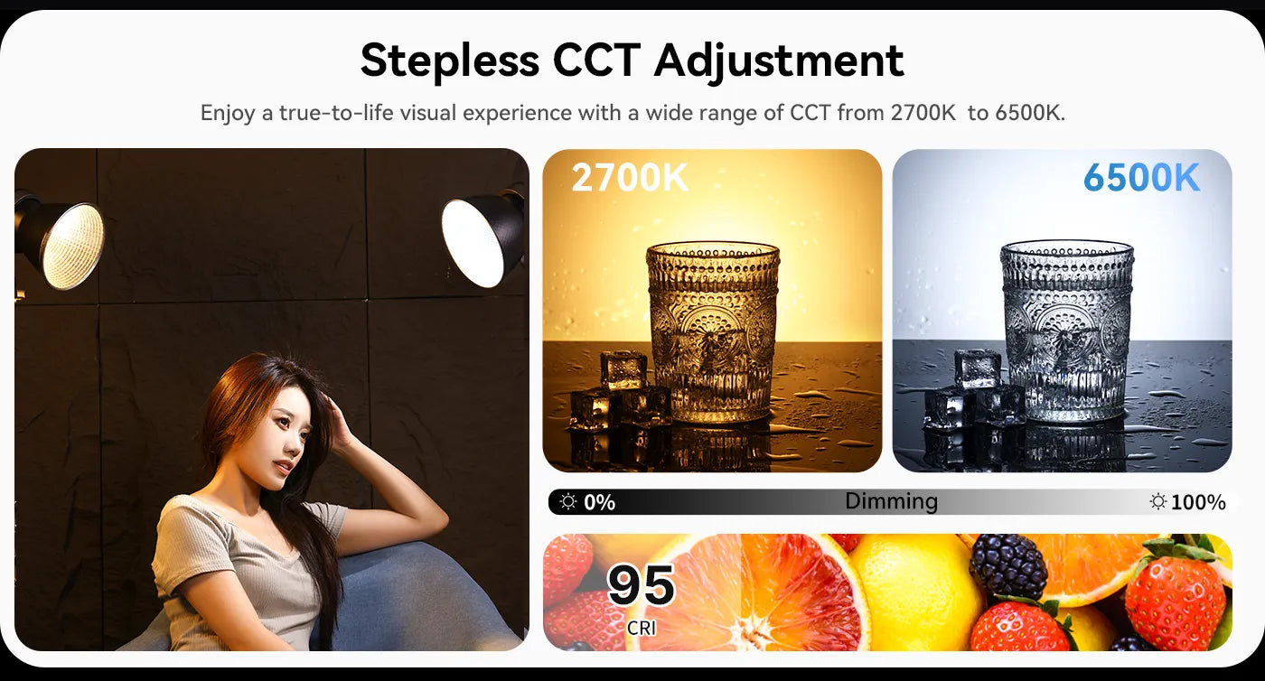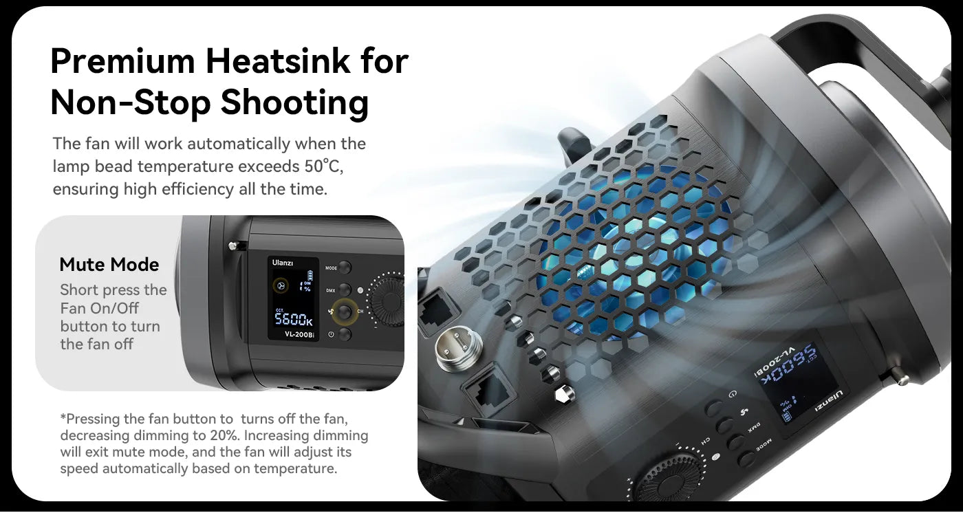 With dual power options, use a V-mount battery for outdoor mobility or a DC power adapter for stable indoor use. Adjust the color temperature steplessly from 2700K to 6500K (CRI>95) and dim from 0% to 100%. The premium heatsink ensures continuous shooting, with an automatic fan and mute mode for quiet operation.