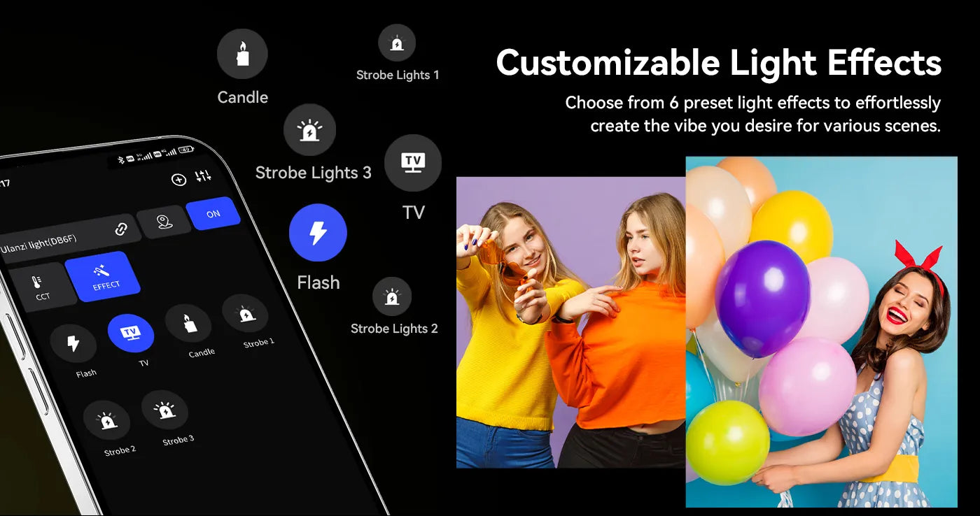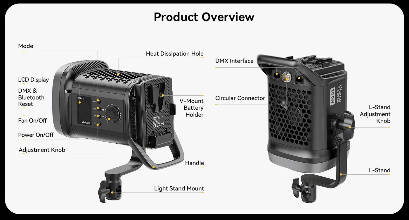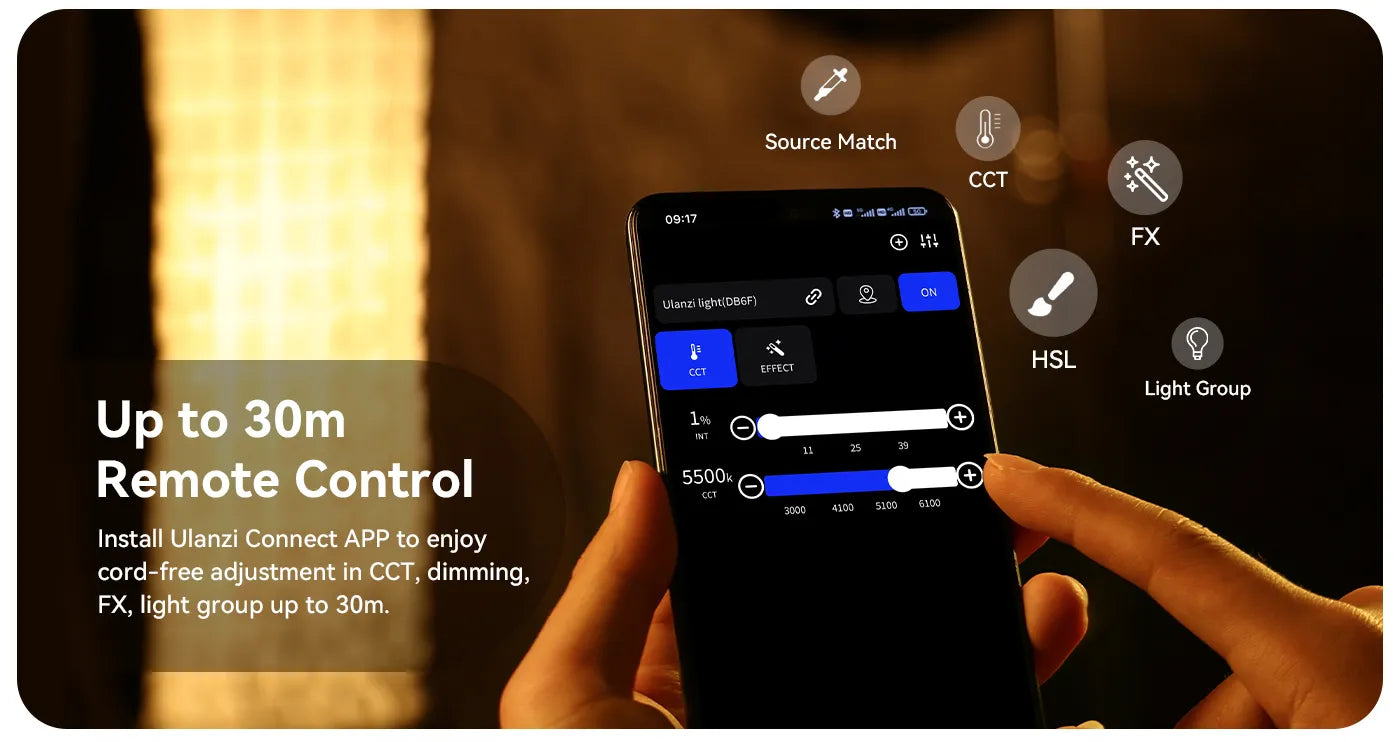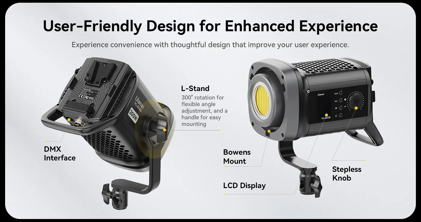 Control your lighting up to 30m away using the Ulanzi Connect APP. The user-friendly design includes an LCD display, stepless knob, 300° rotating L-stand, Bowens mount, and DMX interface for multi-light control.