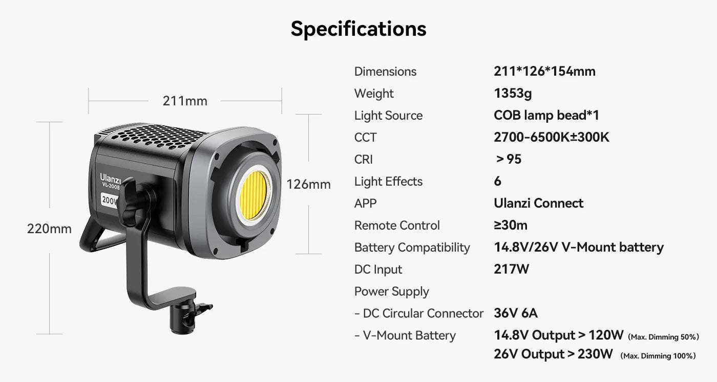 - VL-200Bi 200W Light / 26000mAh V-Mount Battery*1 PC