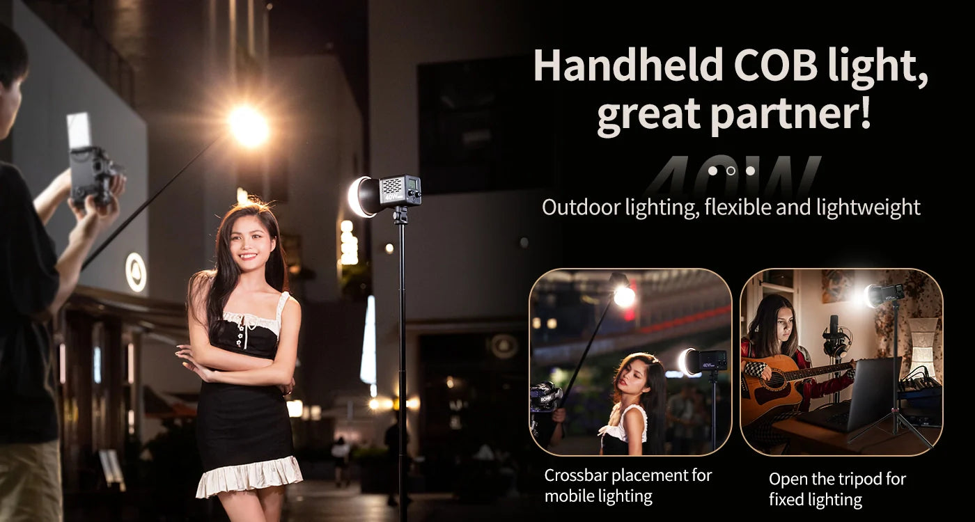 Ulanzi 120W LED Continuous Output Video Light, 2700 - 6500K Bowens Mount Photography Light, 20700lux@1m CRI95+ Studio Light , Remote Controller for Portrait Shooting and Video Recording. Featuring dual power options, use a V-mount battery outdoors for mobility or a DC power adapter indoors for stable power. Control your lighting up to 30m away with the Ulanzi Connect APP, customizing settings like CCT, dimming, FX, and light groups.