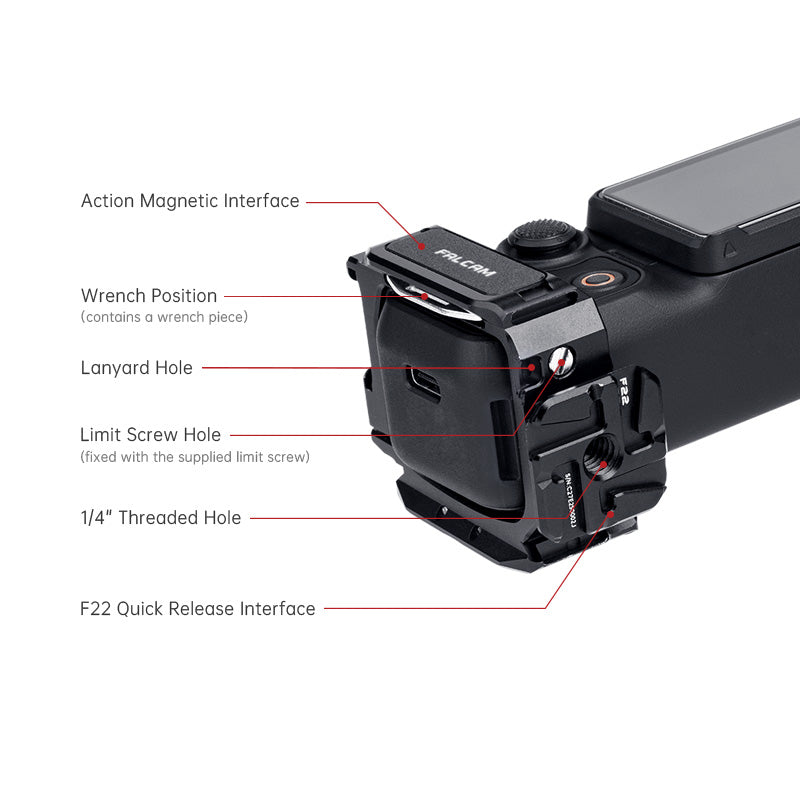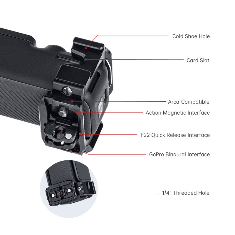 Equipped with six commonly used ports including F22 Quick Release, Action Magnetic Interface, GoPro Binaural Interface, Cold Shoe 1/4"Threaded Hole, and Lanyard Hole, accommodating accessories like external microphones, lights, handles, backpack clips, and wrisst straps.