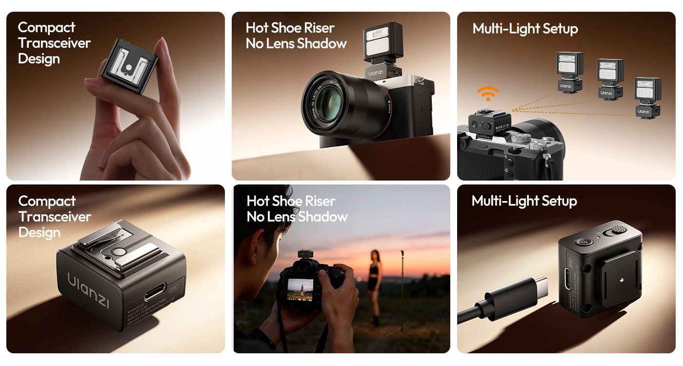 One transmitter connects to multiple receivers for multi-light setups and creative lighting effects.