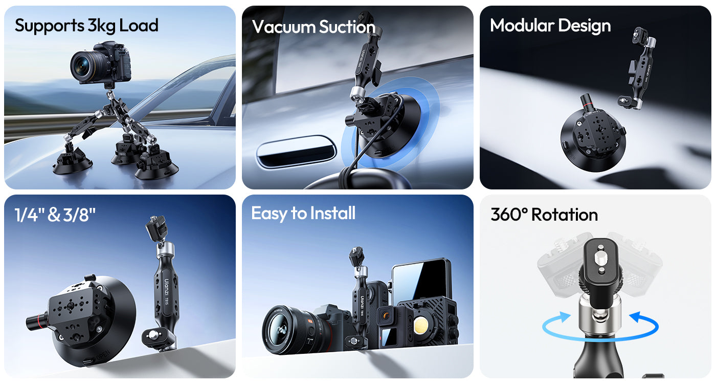 Built on a rock-solid triangular structure formed by the suction cup and bracket, it delivers unmatched stability and keeps heavy-lens cameras securely in place.