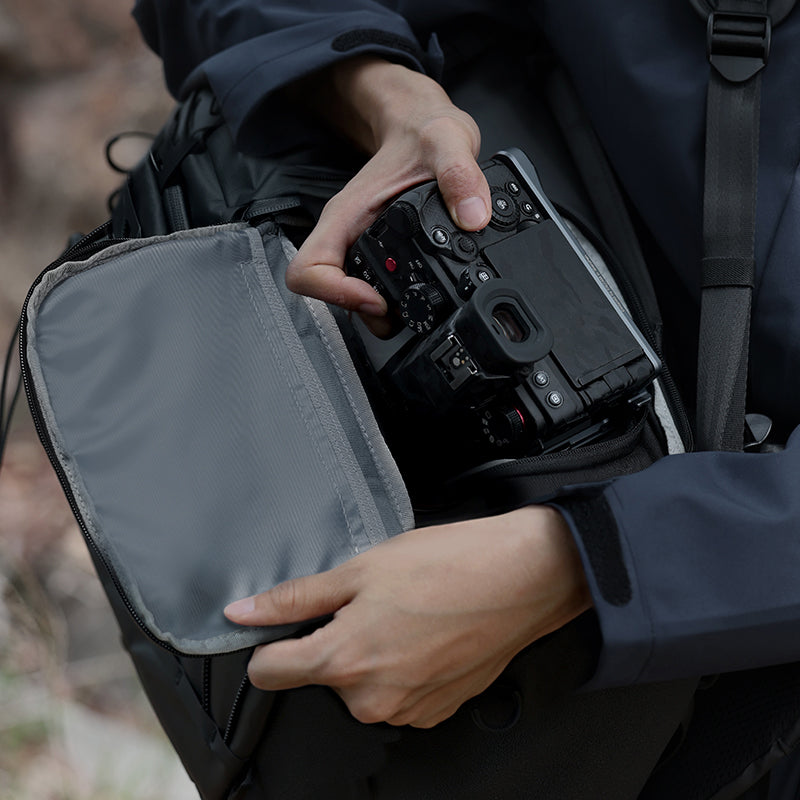 Stay in the action with a quick-access pocket on the right, allowing you to grab your camera or gear instantly without removing the pack.