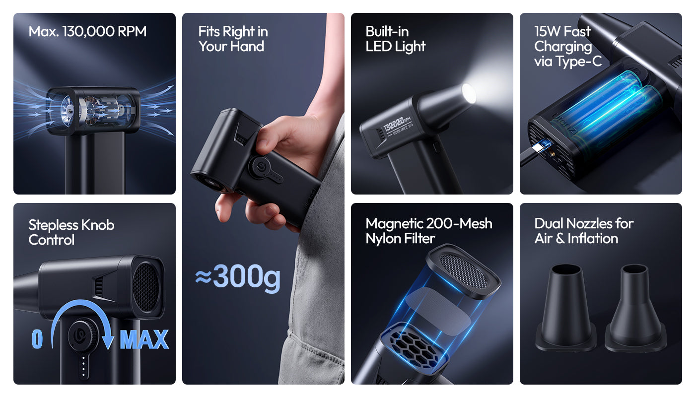 With a turbocharged motor spinning at 130,000 RPM, it delivers intense airflow to wipe out dust in seconds.