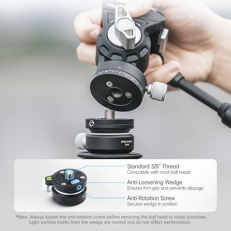*Note: Always loosen the anti-rotation screw before removing the ball head to avoid scratches. Light surface marks from the wedge are normal and do not affect performance.