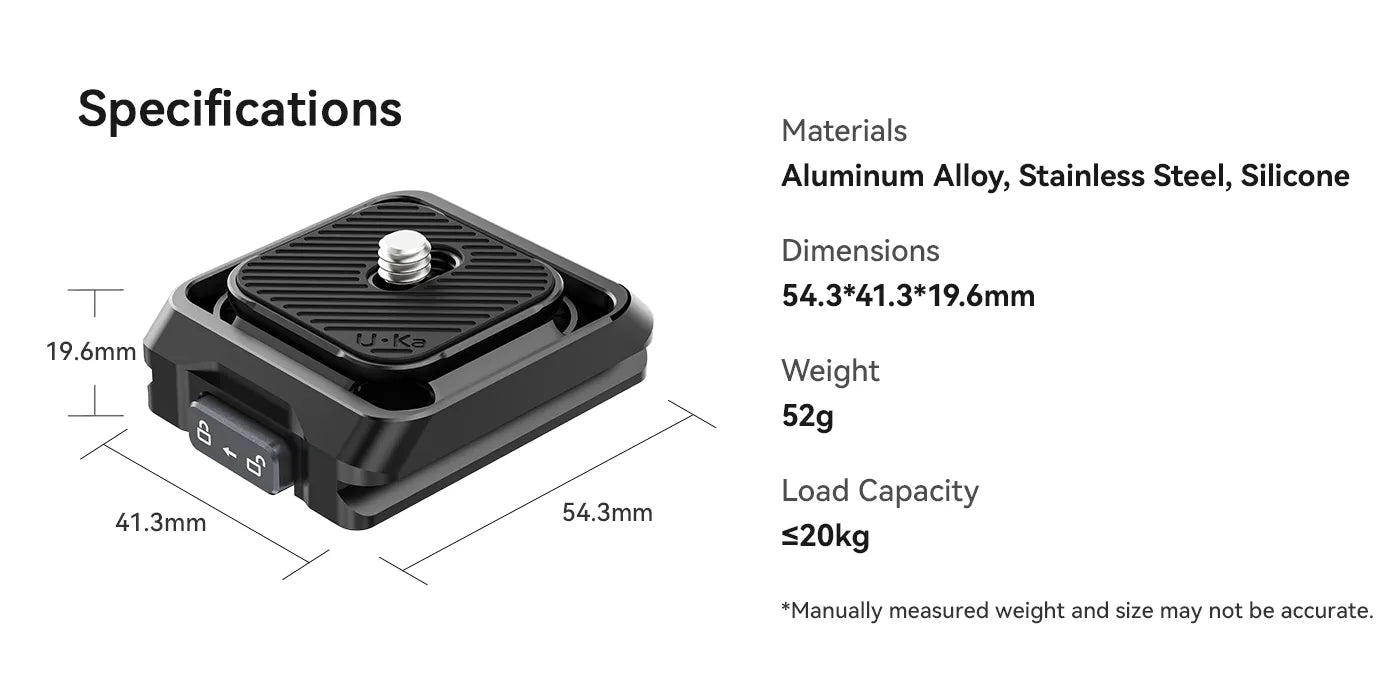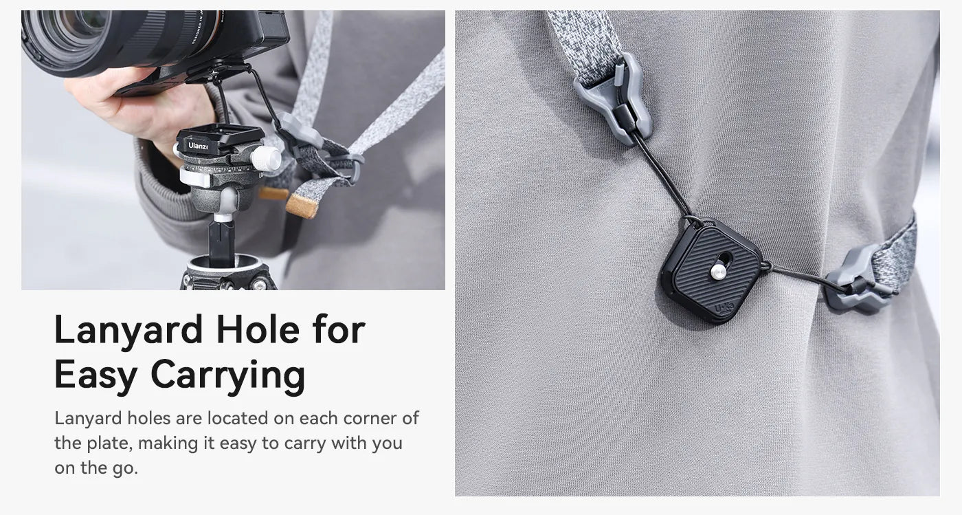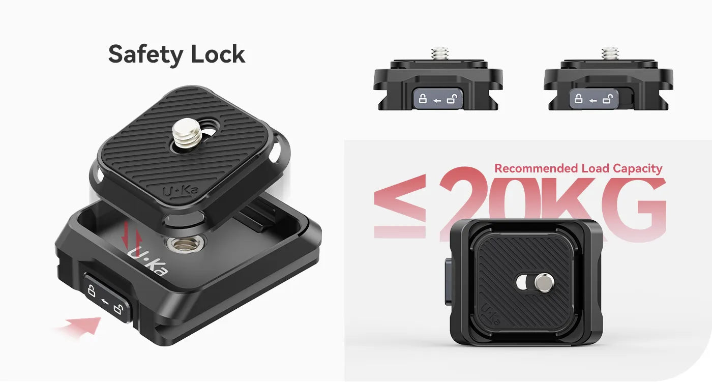 The Ulanzi Uka Quick Release Plate and Base Kit C007 offers seamless device switching for uninterrupted shooting. Attach effortlessly by aligning at an angle, pressing down until you hear a "click." With a tight-fitting screw and all-round protection, it prevents device falls, supporting up to 20kg. Compatible with Uka and F38 quick release plates, it allows quick installation from any direction. Featuring Arca-Swiss interfaces, 1/4" and 3/8" threaded holes, and Arri locating holes, it works with various devices and accessories. Lanyard holes on each corner ensure easy portability. Enhance your setup with this versatile, reliable, and convenient kit.