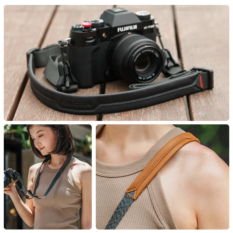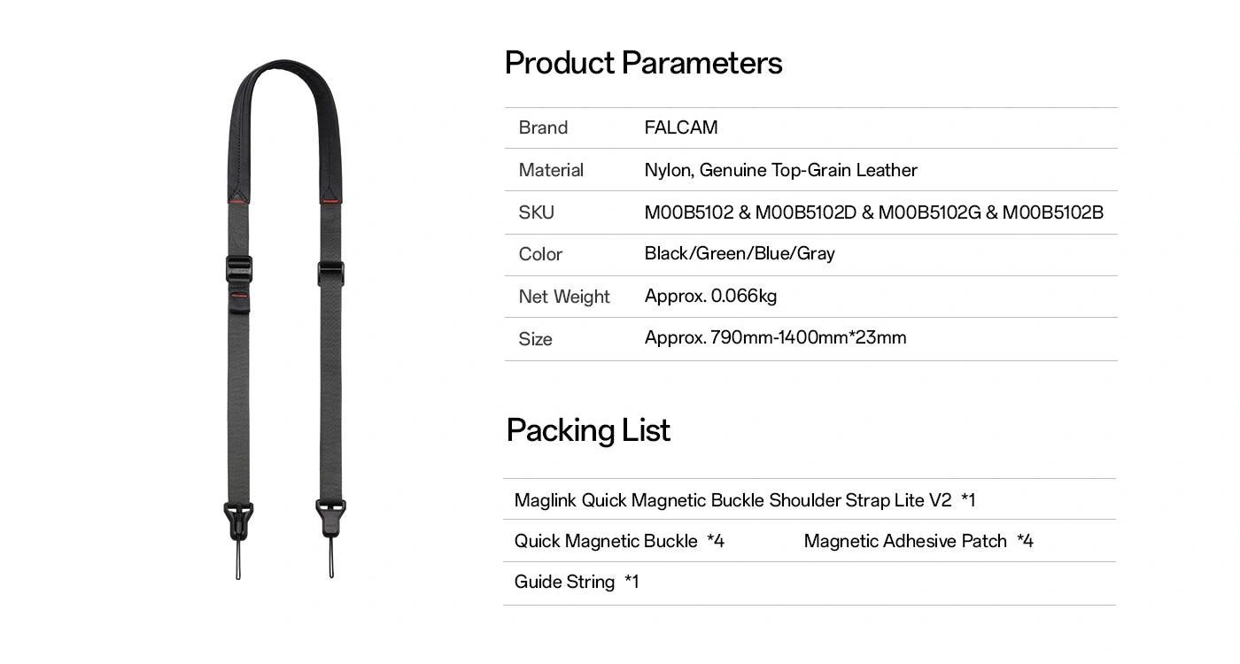 The female buckle aligns magnetically and secures in one second, keeping the strap stable on the shoulder.