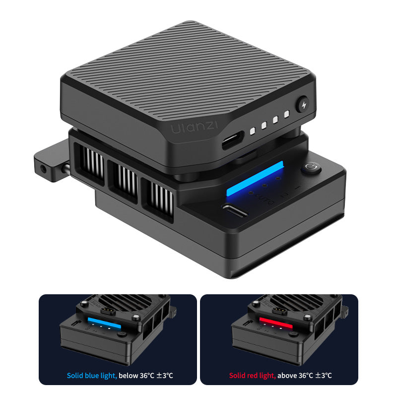 Ulanzi CU01 Camera Cooler Kit, black with charging indicators and ports, perfect for camera cooling.
