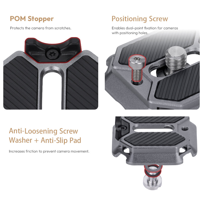 - Anti-Loosening Screw Washer + Anti-Slip Pad- Increases fricticon to prevent camera movement.