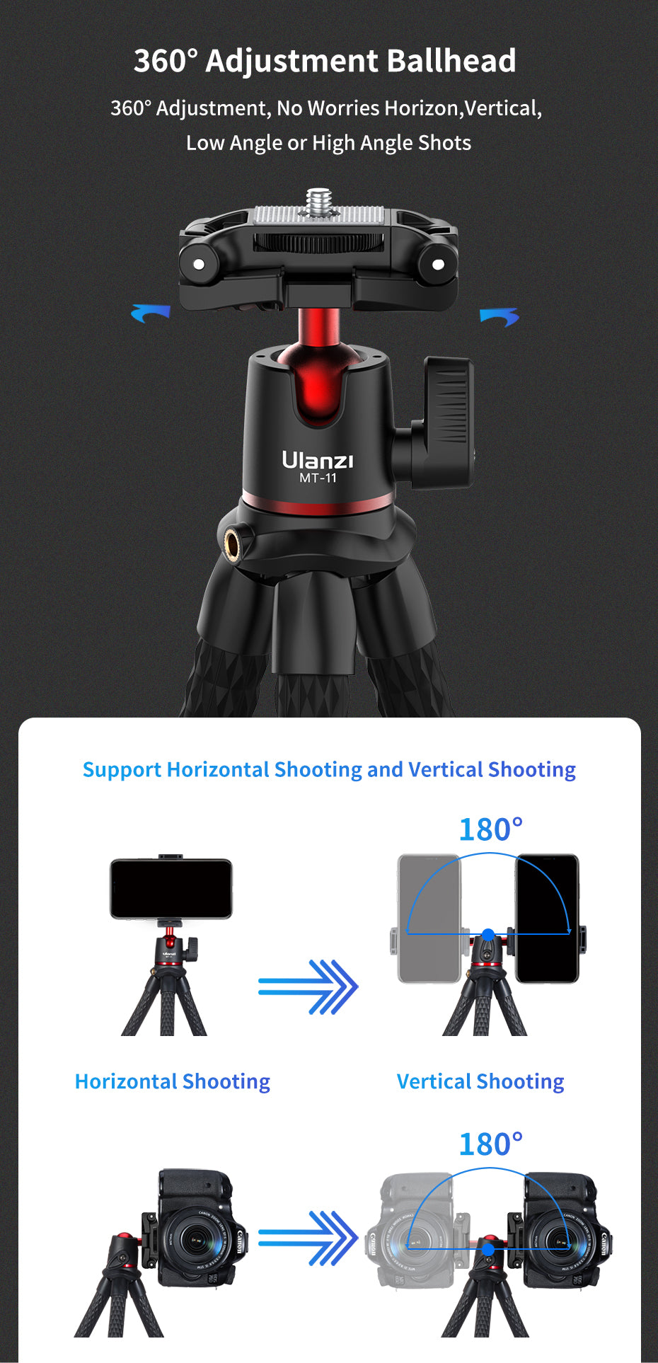 Ulanzi MT-11 Octopus Tripod supports cameras, DSLRs, smartphones, tablets, lights, and speakers weighing up to 2kg. Can be configured for still photography, cinematography, vlogging, or live streaming in 3 modes: grip, wrap or stand.