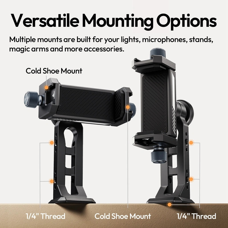 • 2. Versatile Mounting: Cold shoe, 1/4” and 3/8" screw holes for lights, mics, and stands.
