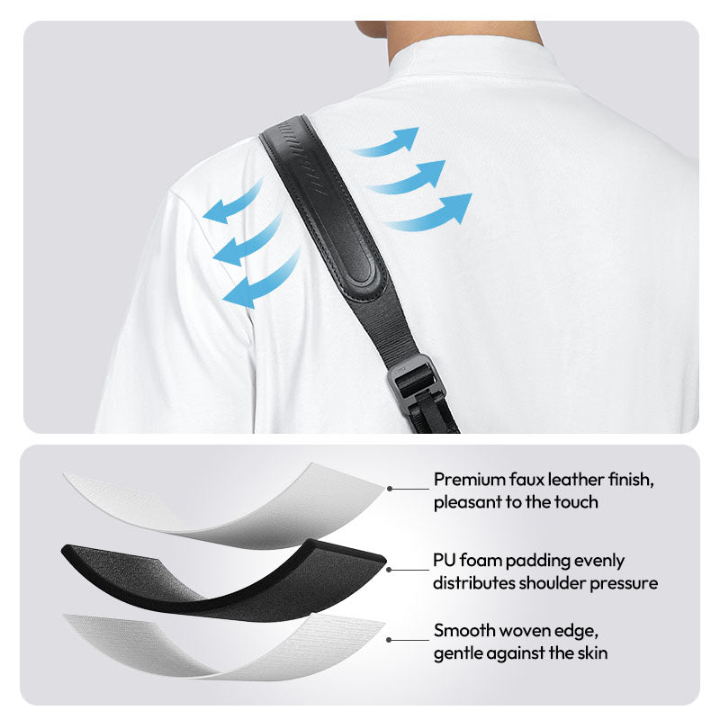 Crafted with supple leather-like texture, naturally conforming padding, and a widened 3.8cm strap for superior comfort and effective weight distribution.