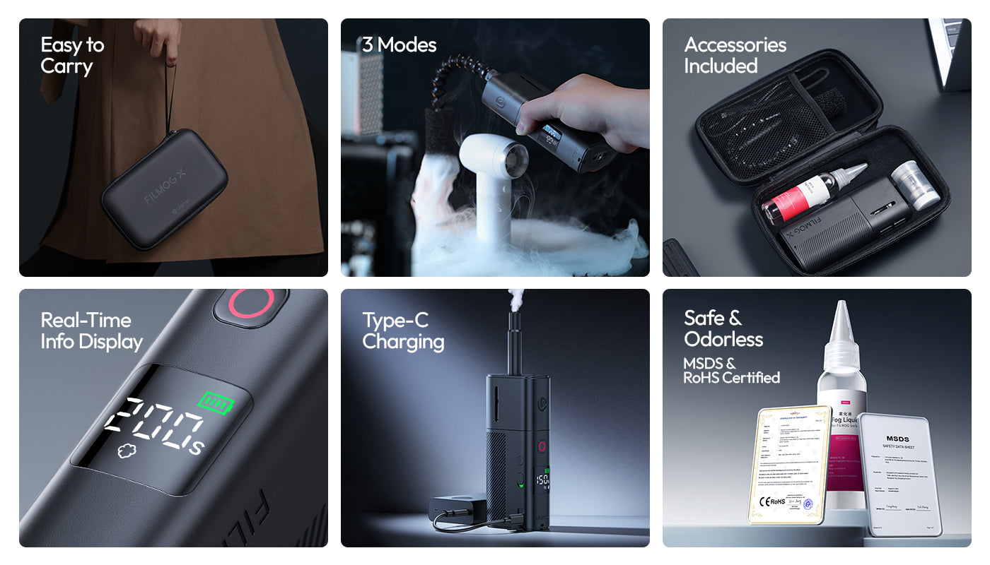 Choose from three modes to match your scene: Mist Mode for atmospheric vibe, Dense Fog Mode for dramatic effects, and Dry Ice Mode for a unique smoky touch—each designed to bring your vision to life.