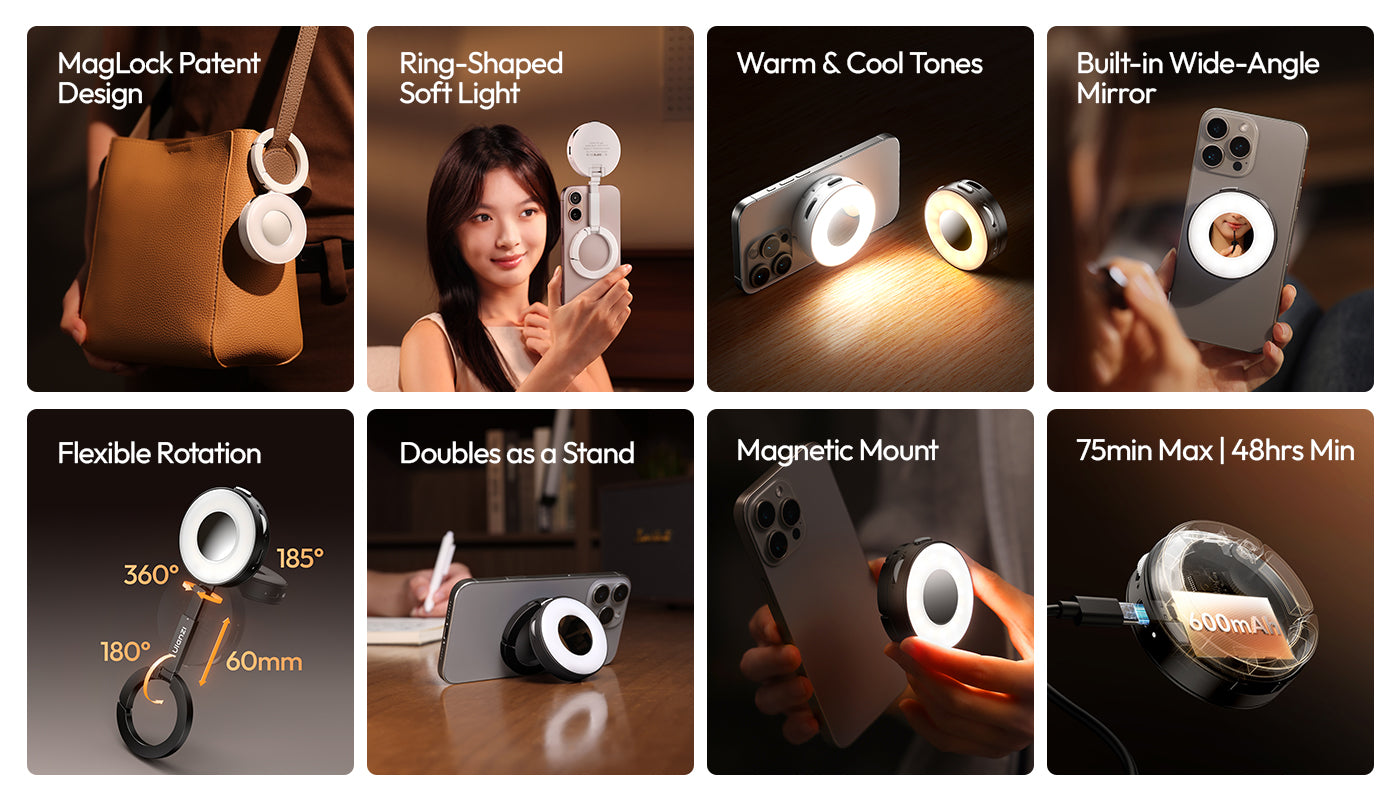 - More Lighting Options: Magnetic Phone Grip, Desktop Stand, Magnetic Phone Stand, Metal Surfaces.