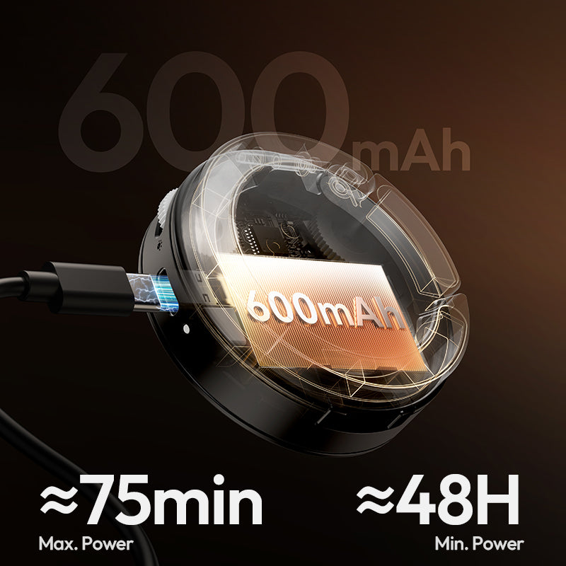 Equipped with a 600mAh battery and Type-C fast charging, it powers up to 48 hours of use on a single charge.