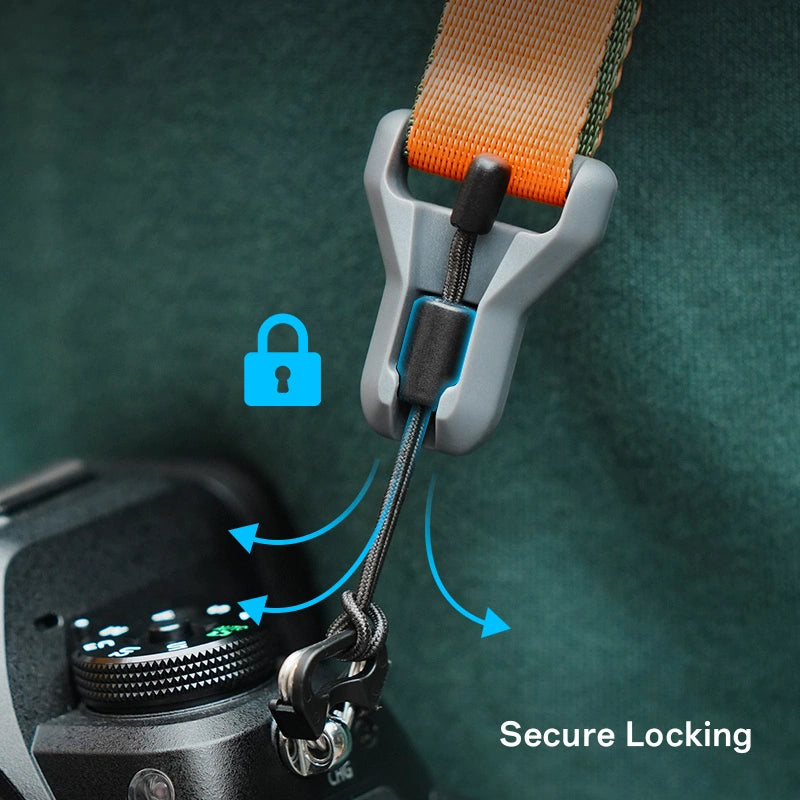 The female buckle aligns magnetically and secures in one second, keeping the strap stable on the shoulder.