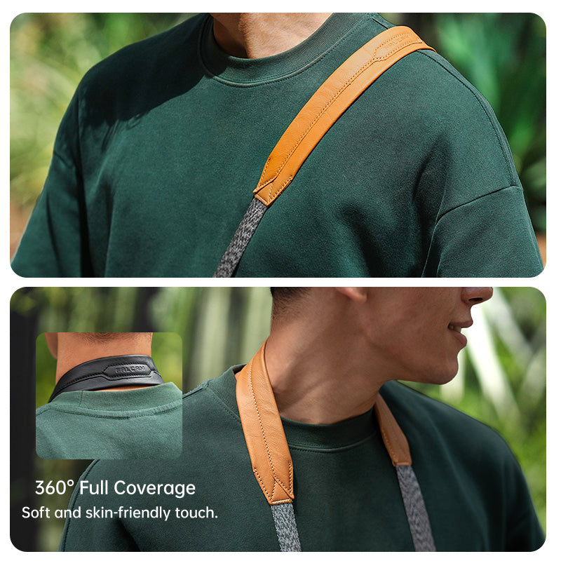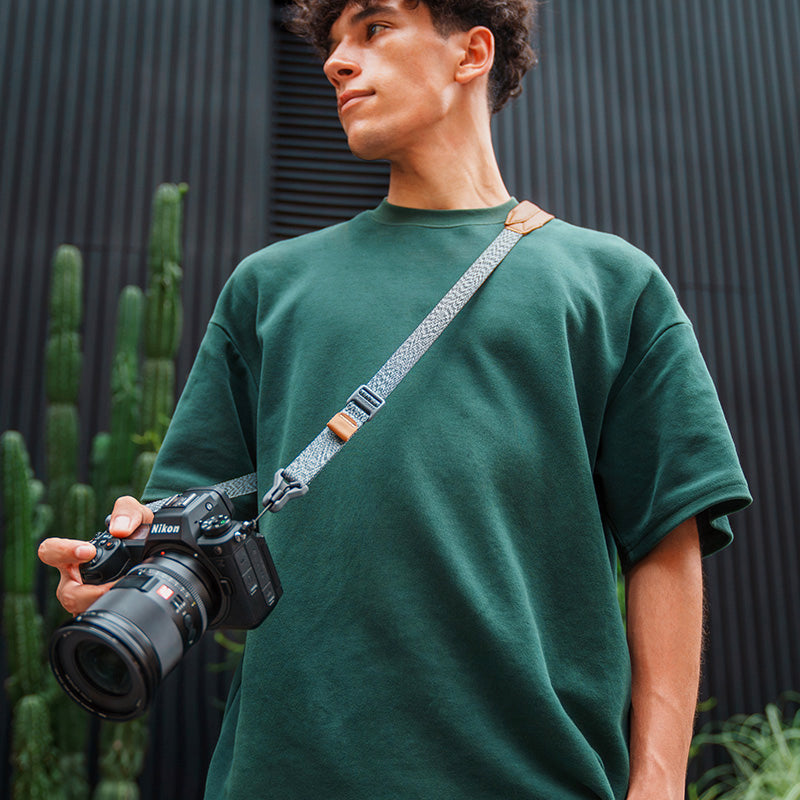 The female buckle aligns magnetically and secures in one second, keeping the strap stable on the shoulder.