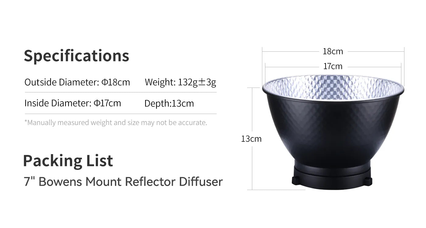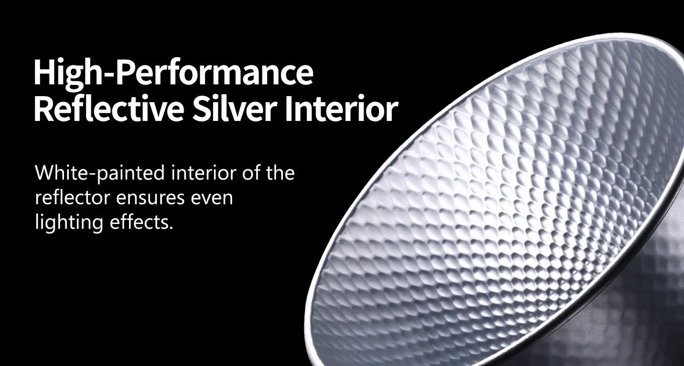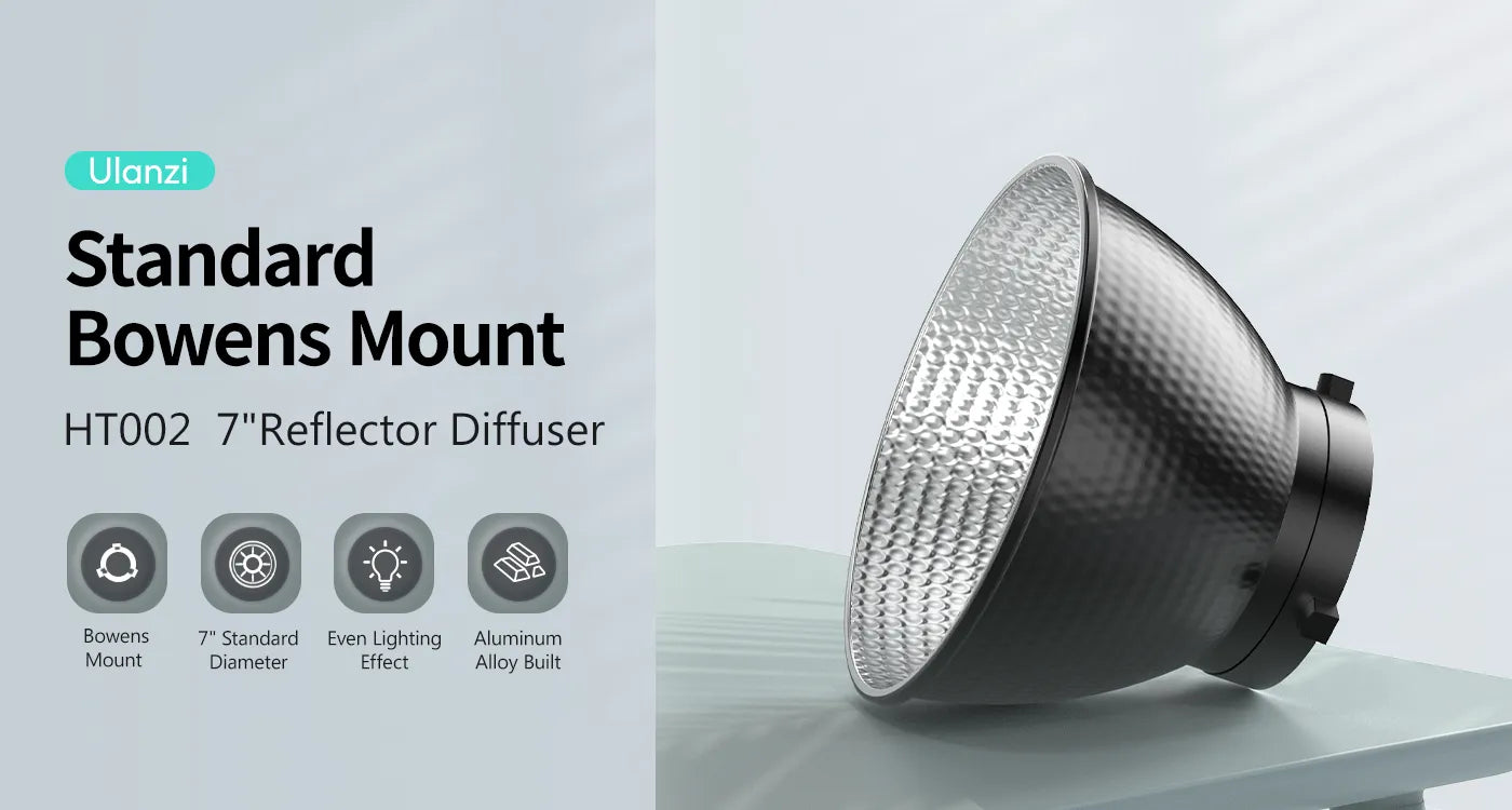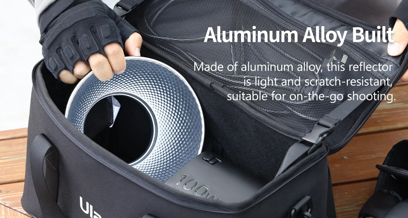 Le réflecteur diffuseur Ulanzi HT002 7" pour monture Bowens standard est idéal pour une large gamme d'éclairages équipés d'une monture Bowens standard, notamment les modèles Ulanzi 100 W , 120 W et 200 W. Son intérieur argenté réfléchissant haute performance assure des effets lumineux uniformes, tandis que son intérieur peint en blanc optimise la répartition de la lumière. Fabriqué en alliage d'aluminium léger et résistant aux rayures, ce réflecteur est idéal pour les prises de vue en déplacement. À noter : seul le réflecteur diffuseur est inclus.