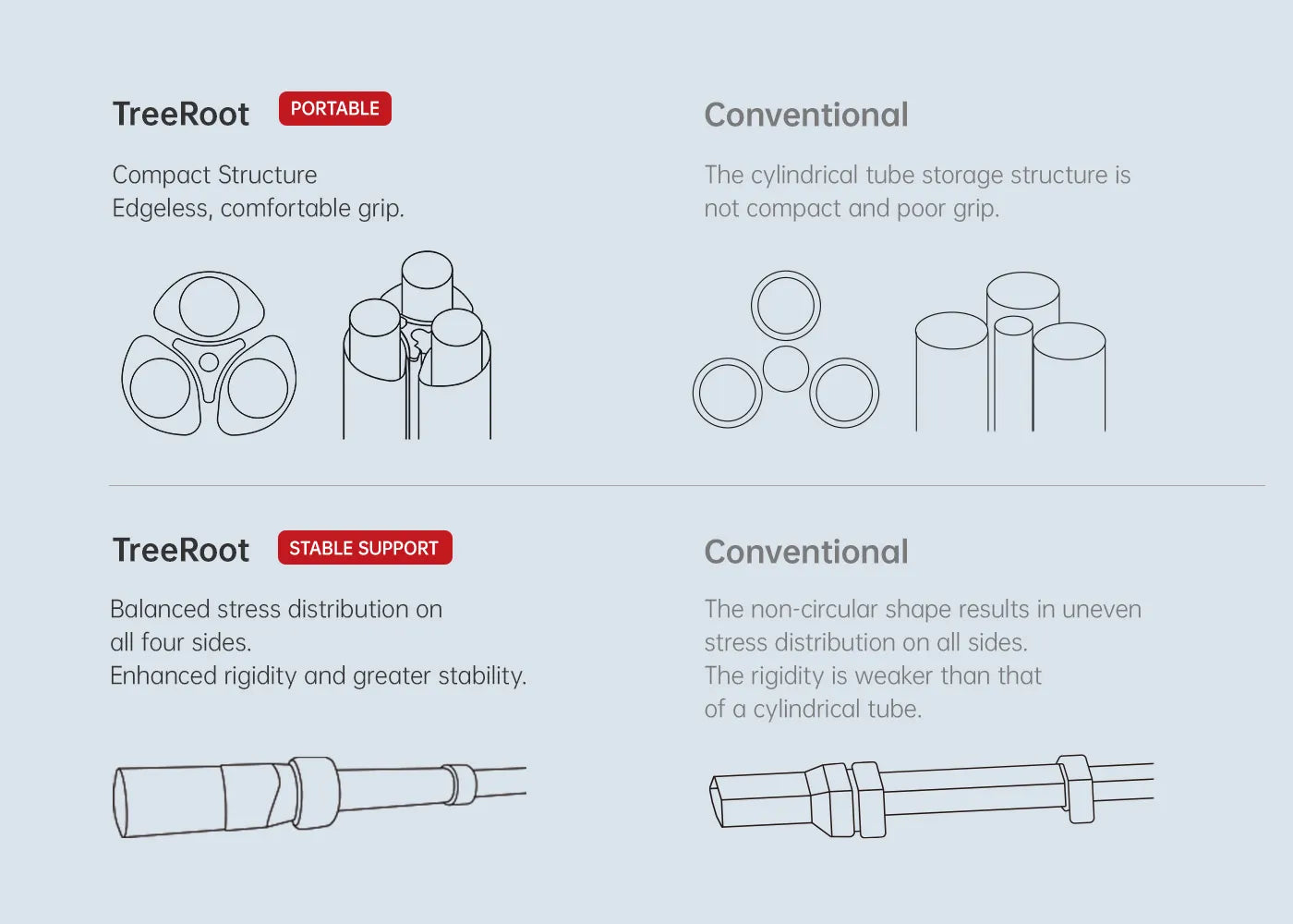 Ce tube triangulaire Reuleaux est une innovation dans l'intégration de tubes anisotropes et ronds, améliorant ainsi la portabilité et la stabilité globale. Sa conception assure un ajustement parfait et affleurant lors du rangement, avec des contours qui épousent naturellement la main. Il offre notamment une meilleure stabilité globale à la base que des tubes cylindriques comparables de même diamètre.