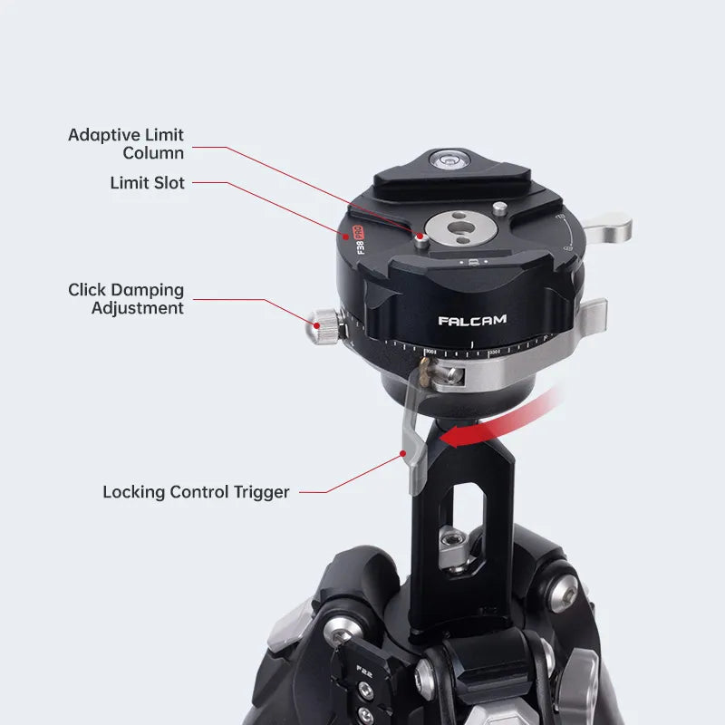 L'interface de la rotule à dégagement rapide contient des conceptions de colonne de limite adaptatives et de fentes compatibles avec la plupart des structures de limite de plaque à dégagement rapide Arca-Swiss, offrant une protection antidérapante.