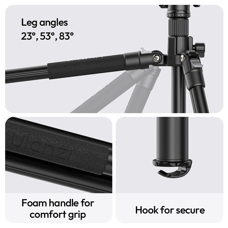 Les pieds à quatre sections et la colonne centrale à deux sections offrent des réglages de hauteur flexibles jusqu'à 180 cm, répondant à tous vos besoins créatifs pour les angles hauts et bas.