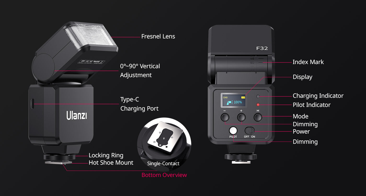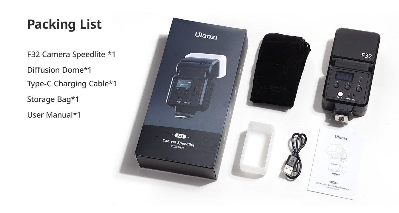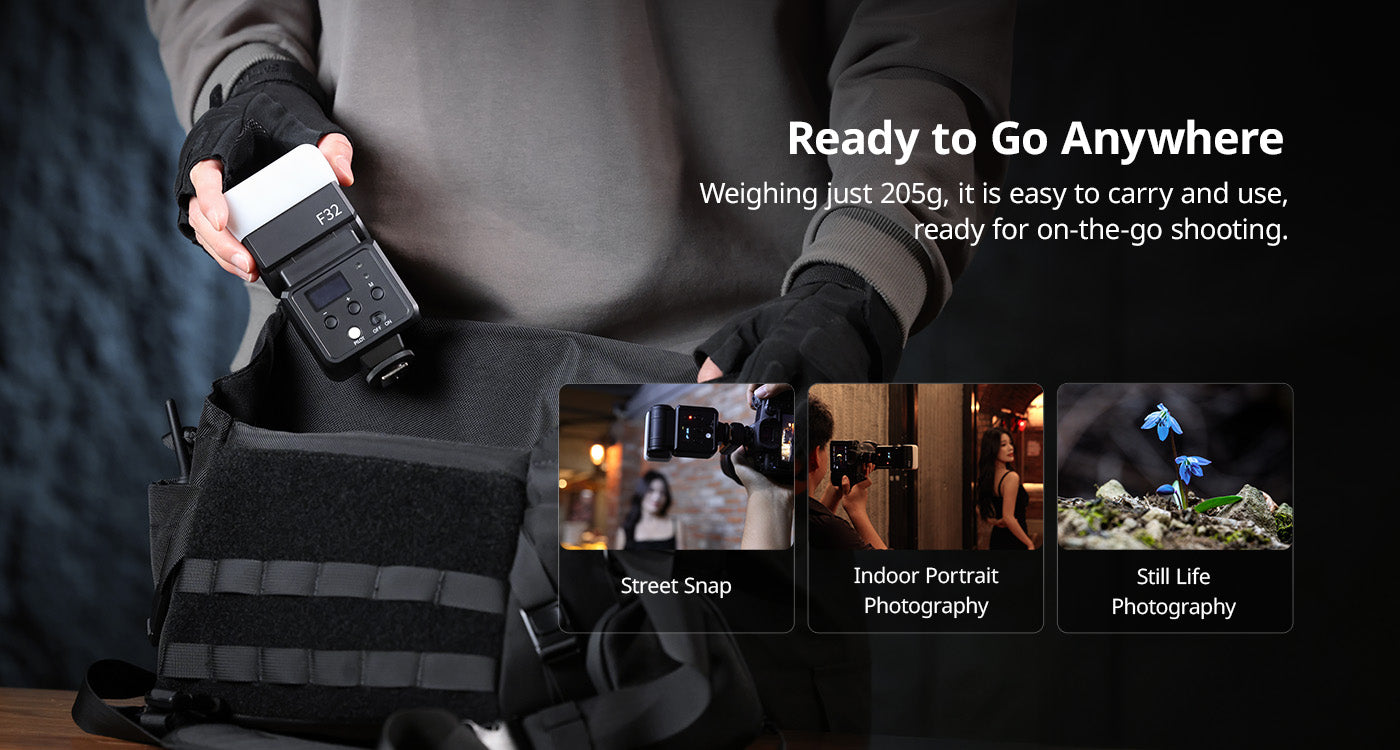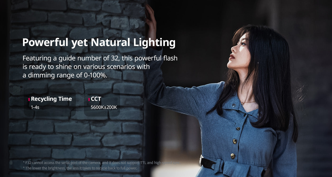 Le flash F32 est compatible avec la plupart des appareils photo du marché équipés d'une griffe porte-accessoire. Sa lumière, proche de la lumière naturelle, est idéale pour la photographie de rue, les portraits et les natures mortes. Il peut également être utilisé avec un déclencheur de flash sans fil .