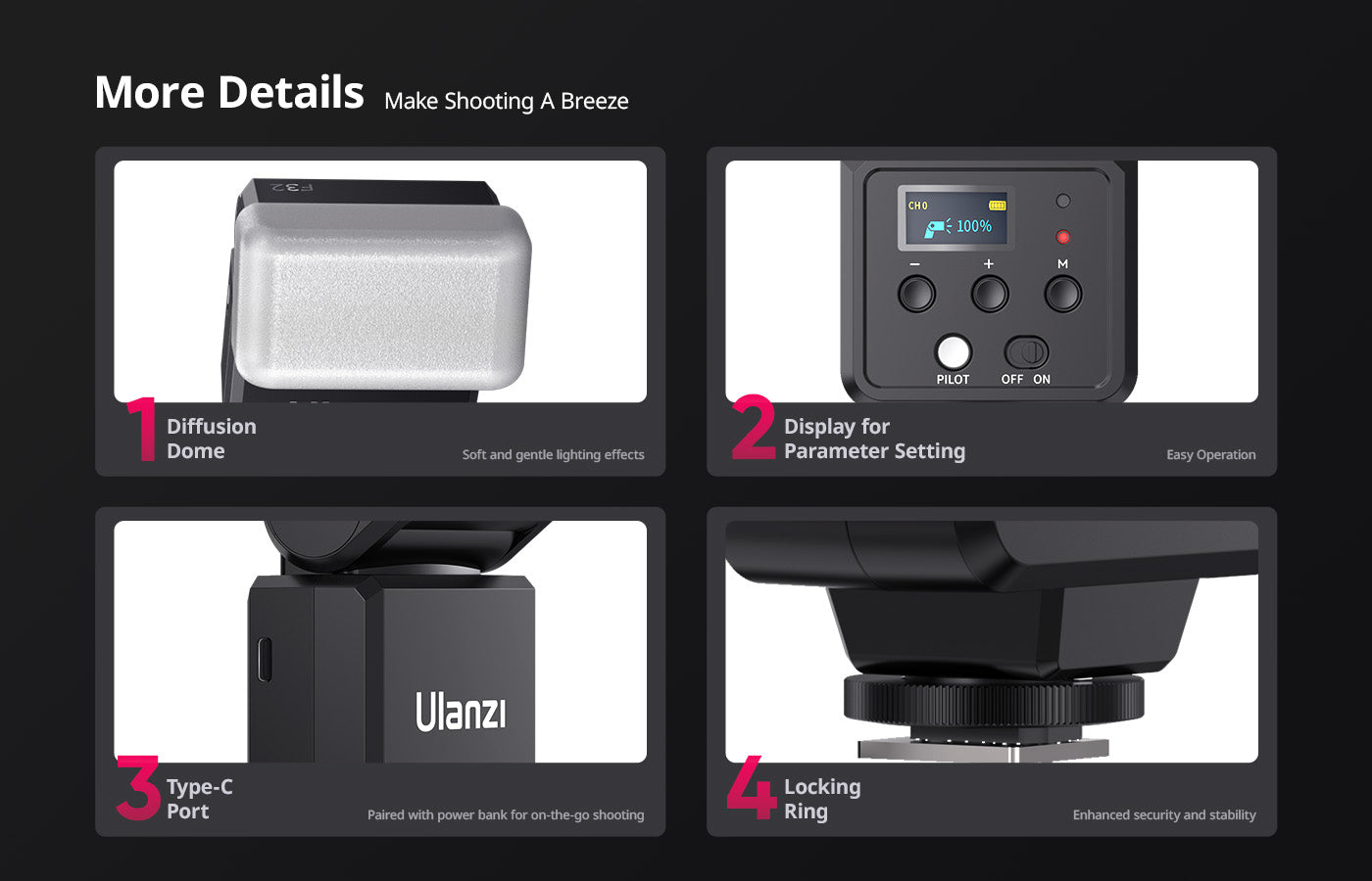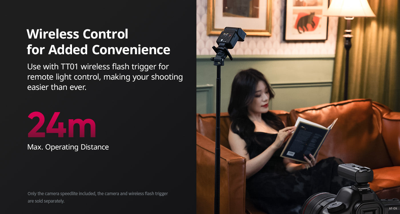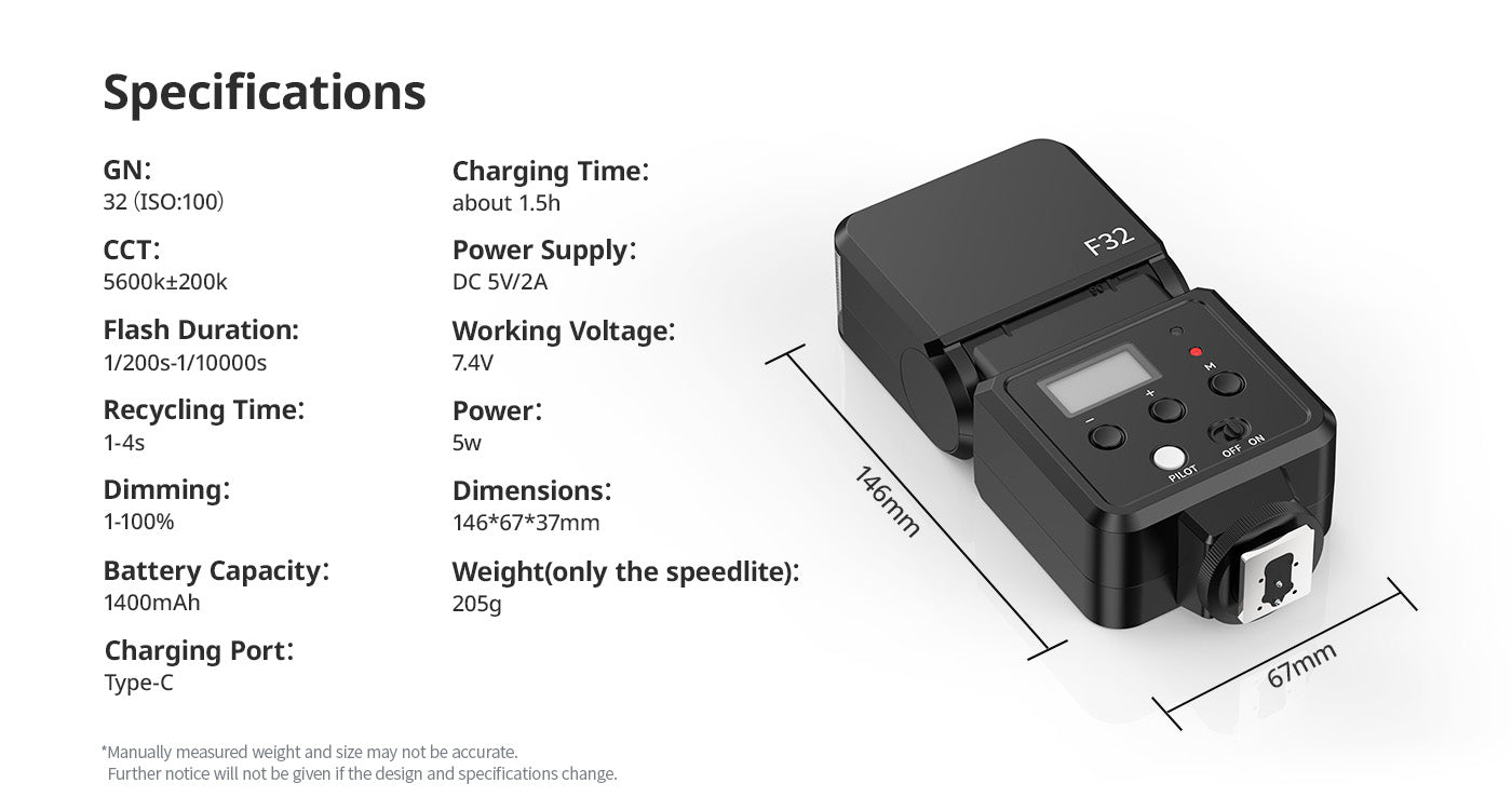 Le flash F32 est compatible avec la plupart des appareils photo du marché équipés d'une griffe porte-accessoire. Sa lumière, proche de la lumière naturelle, est idéale pour la photographie de rue, les portraits et les natures mortes. Il peut également être utilisé avec un déclencheur de flash sans fil .