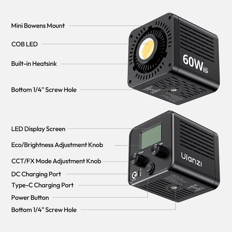 High-quality COB LEDs deliver steady, uniform 60W output, ensuring bright, clear lighting for all your projects.