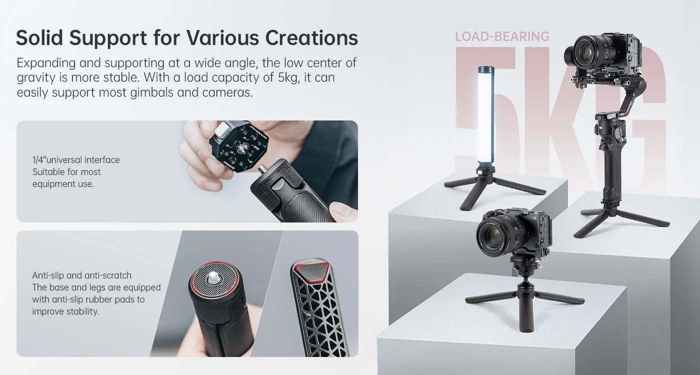 Experience ultimate convenience with the Ulanzi Falcam TreeRoot Quick Open Desktop Tripod. Its innovative quick open linkage structure allows you to fully open and close all legs with a single motion, making transitions between grip and support effortless. Offering solid support for various creations, it boasts a 5kg load capacity, ideal for most gimbals and cameras.