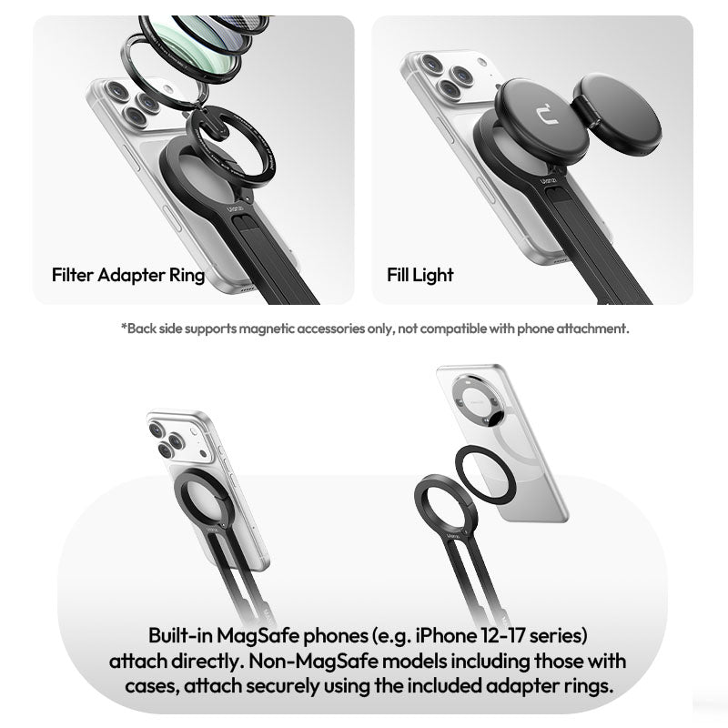 MagSafe-compatible front with N52 magnets secures your phone, while the back connects to magnetic accessories for creative shooting setups.