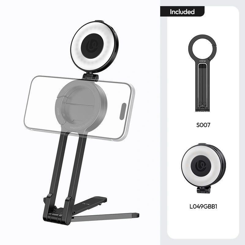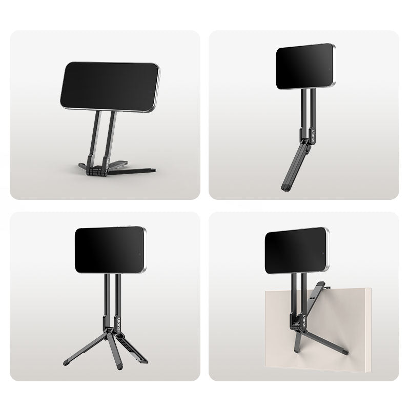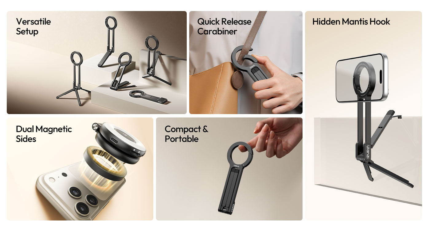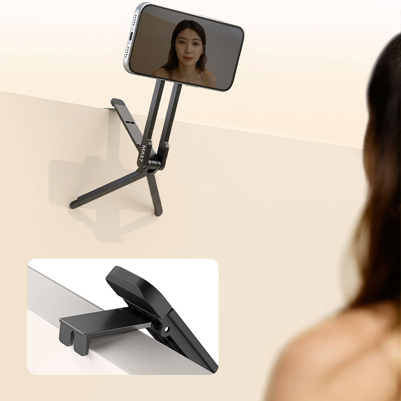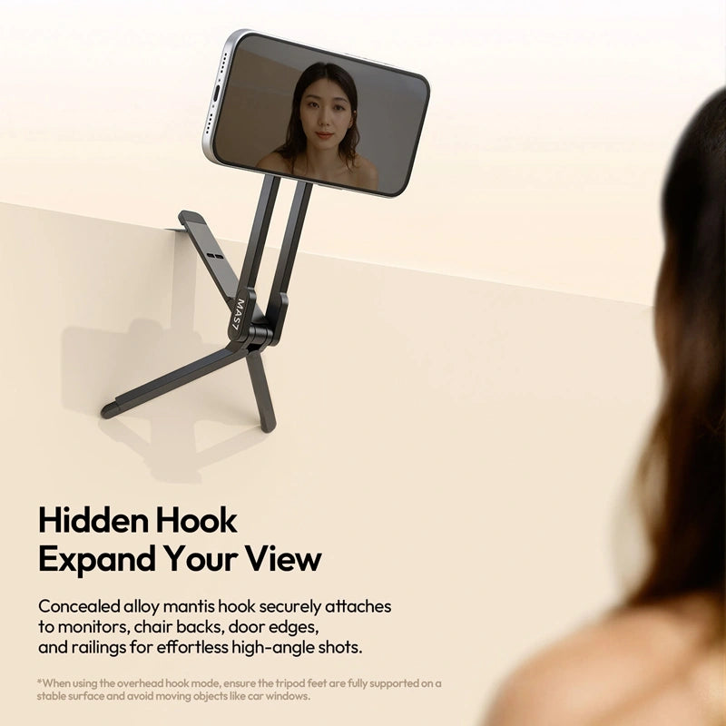 Concealed alloy mantis hook securely attaches to monitors, chair backs, door edges, and railings for effortless high-angle shots.