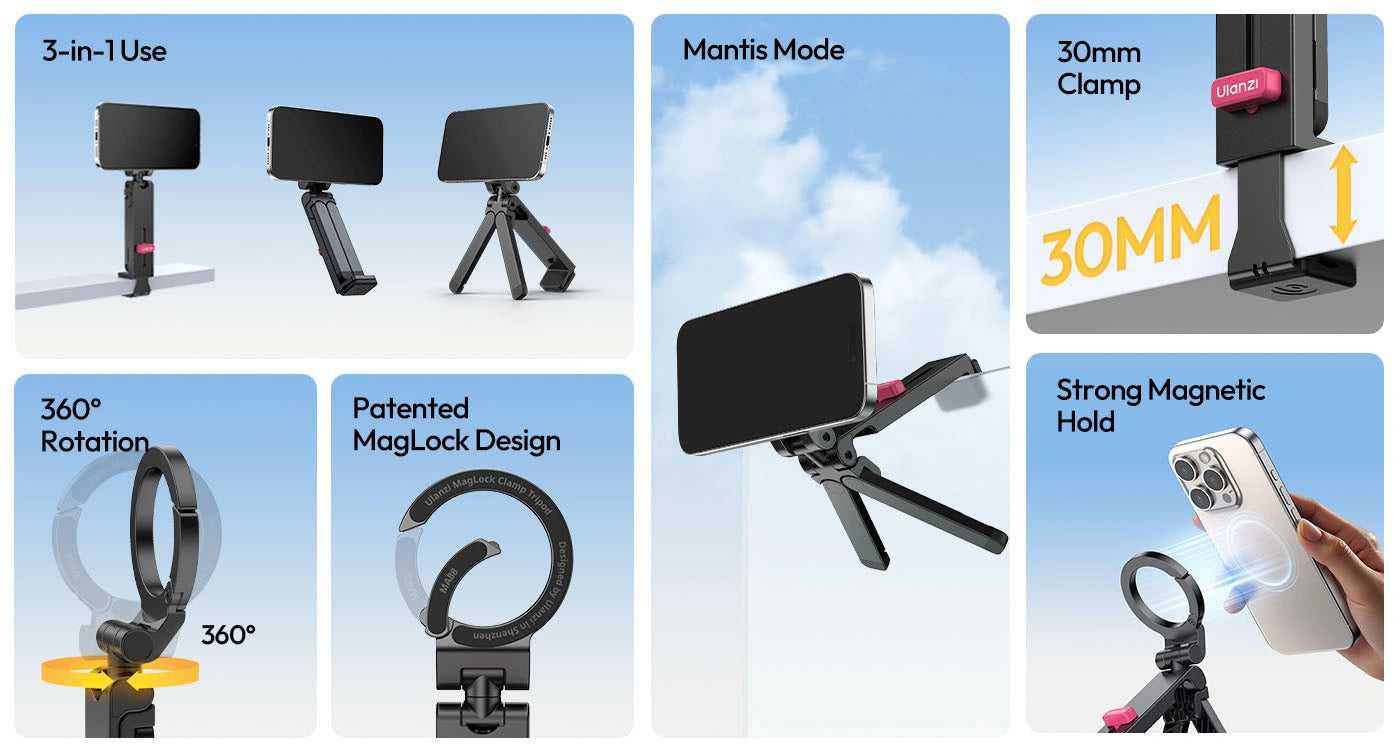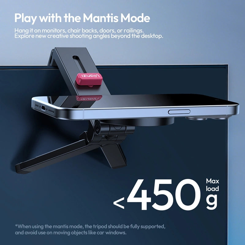 • 2. All-in-one: Tripod, Selfie Stick, Mantis Mode, Luggage Mounting
